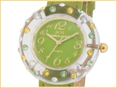 透明感のあるケースに、クリスタルとオリーブに新しくライトトパーズのストーンが入ってより華やかな色に。フランス生まれのボンボンウオッチならではの色合いで、珍しいカラーで日本にはない色合いです。